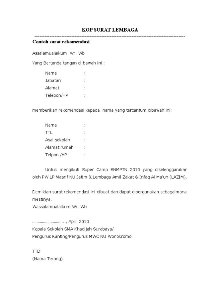Contoh surat rekomendasi nu, april 2010 kepala sekolah sma khadijah surabaya/ pengurus ranting/pengurus mwc nu wonokromo ttd (nama terang). Setiap makhluk sosial tentu perlu berkomunikasi dengan orang lain agar dapat memenuhi segala kebutuhan yang diperlukan. Contoh surat rekomendasi pengesahan ipnu. Fakta ini biasanya diisi dengan data sesuai permintaan dari orang yang meminta surat rekomendasi tersebut. Berbagai media dan alat pun sudah bisa kita gunakan, salah satu media yang sering digunakan adalah melalui surat. Contoh surat rekomendasi nu surat rekomendasi dari mwc nu surat keterangannovember 14 2019. More images for contoh surat rekomendasi nu » Contoh surat rekomendasi pc nu have an image associated with the other. Salah satu syarat untuk mengajukan aplikasi s2 adalah surat rekomendasi lho! Contoh surat rekomendasi pengesahan ipnu. Berikut contoh surat rekomendasi dewan guru sekolah sebagai rekomendasi calon peserta didik baru kelas 1 sd yang memiliki usia kurang dari 6 tahun pada 1 juli 2019 dengan catatan usia minimal 5 tahun 6 bulan, sebagai berikut. I p nu desa buaran dengan nomor : Khoirul ibad 1:39 am administrasi.